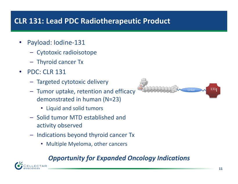 10 PDC Product Development Pipeline PDC Program Payload Indication Discovery Phase I Phase II CLR 131 Iodine - 131 Multiple Myeloma Preclinical CLR 125* Iodine - 125 Micrometast. Disease CLR CTX NP cytotoxics (Undisclosed) Undisclosed CLR 1603 - PTX PTX CLR CTX PTX, GEM, GEL Performance - based Performance - based CLR 124 Iodine - 124 CLR 1502 IR - 775 Glioma Breast Cancer Lumpectomy Radio Tx Dx CDx In - House Development Collaborations Class * The development of CLR 125 is fully funded by a NCI Phase I/II Fast - Track SBIR research grant award PTX = paclitaxel; GEM = gemcitabine; GEL = geldanamycin Chemo Tx Category Collaboration Platform
