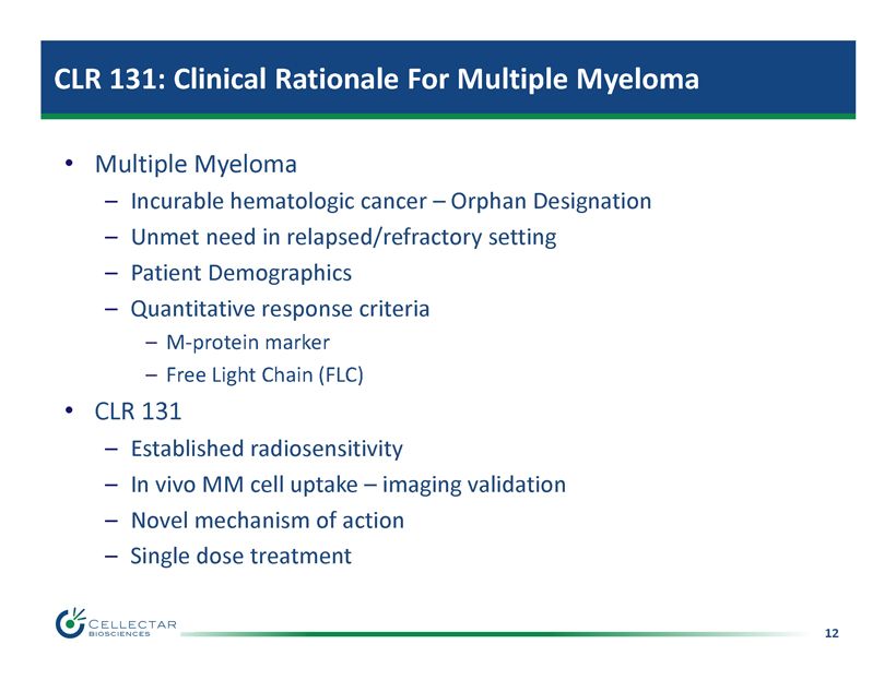 11 CLR 131: Lead PDC Radiotherapeutic Product • Payload: Iodine - 131 – Cytotoxic r adioisotope – Thyroid cancer Tx • PDC: CLR 131 – Targeted cytotoxic delivery – Tumor uptake, retention and efficacy demonstrated in human (N=23) • Liquid and solid tumors – Solid tumor MTD established and activity observed – Indications beyond thyroid cancer Tx • Multiple Myeloma, o ther cancers Linker 131 I Opportunity for Expanded Oncology Indications