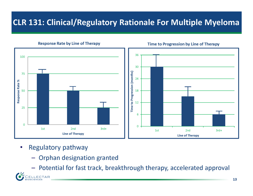 12 CLR 131: Clinical Rationale For Multiple Myeloma • Multiple Myeloma – Incurable hematologic cancer – Orphan Designation – Unmet need in relapsed/refractory setting – Patient Demographics – Quantitative response criteria – M - protein marker – Free Light Chain (FLC) • CLR 131 – Established radiosensitivity – In vivo MM cell uptake – imaging validation – Novel mechanism of action – Single dose treatment 12