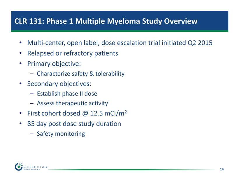 13 CLR 131: Clinical/Regulatory Rationale For Multiple Myeloma • Regulatory pathway – Orphan designation granted – Potential for fast track, breakthrough therapy, accelerated approval 13 Response Rate by Line of Therapy 0 25 50 75 100 1st 2nd 3rd+ Response Rate % Line of Therapy 0 6 12 18 24 30 36 1st 2nd 3rd+ Line of Therapy Time to Progression (months) Time to Progression by Line of Therapy