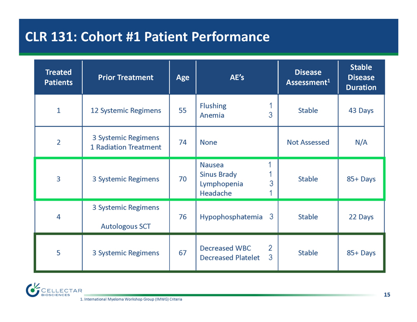 14 CLR 131: Phase 1 Multiple Myeloma Study Overview • Multi - center, open label, dose escalation trial initiated Q2 2015 • Relapsed or refractory patients • Primary objective: – Characterize safety & tolerability • Secondary objectives: – Establish phase II dose – Assess therapeutic activity • First cohort dosed @ 12.5 mCi/m 2 • 85 day post dose study duration – Safety monitoring 14