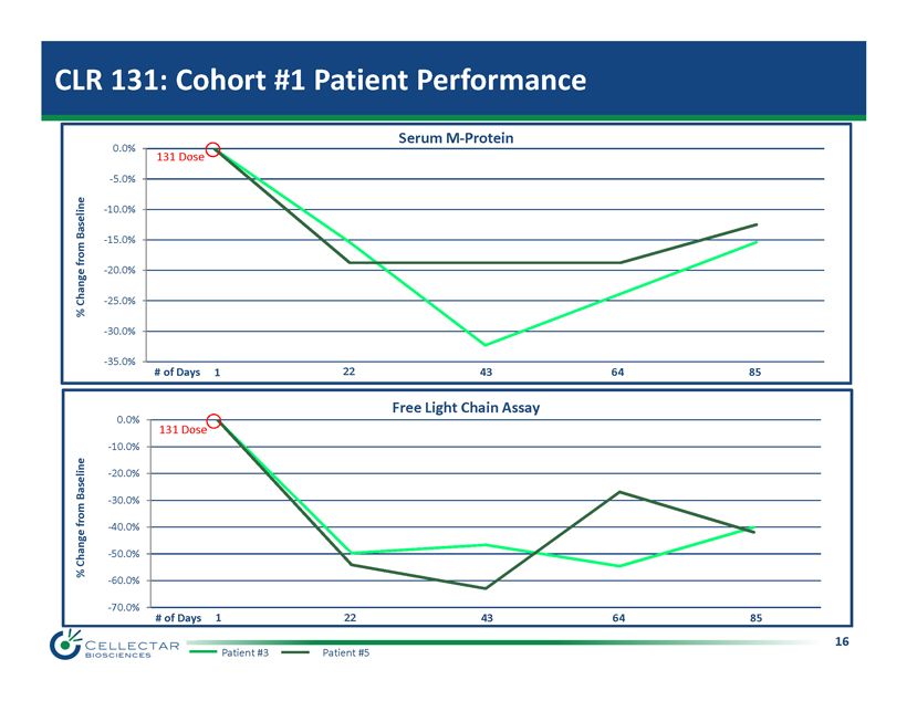 15 CLR 131: Cohort #1 Patient Performance Treated Patients Prior Treatment Age AE’s Disease Assessment 1 Stable Disease Duration 1 12 Systemic Regimens 55 Flushing 1 Anemia 3 Stable 43 Days 2 3 Systemic Regimens 1 Radiation Treatment 74 None Not Assessed N/A 3 3 Systemic Regimens 70 Nausea 1 Sinus Brady 1 Lymphopenia 3 Headache 1 Stable 85+ Days 4 3 Systemic Regimens Autologous SCT 76 Hypophosphatemia 3 Stable 22 Days 5 3 Systemic Regimens 67 Decreased WBC 2 Decreased Platelet 3 Stable 85+ Days 1 . International Myeloma Workshop Group (IMWG) Criteria 15