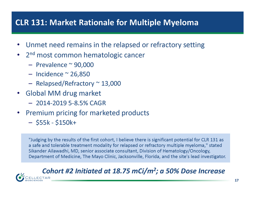16 CLR 131: Cohort #1 Patient Performance % Change from Baseline 16 Patient #3 Patient #5 -70.0% -60.0% -50.0% -40.0% -30.0% -20.0% -10.0% 0.0% 131 Dose % Change from Baseline Free Light Chain Assay # of Days 1 22 43 64 85 -35.0% -30.0% -25.0% -20.0% -15.0% -10.0% -5.0% 0.0% 131 Dose Serum M - Protein # of Days 1 22 43 64 85