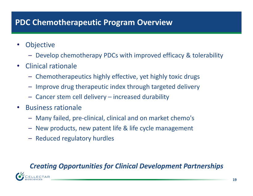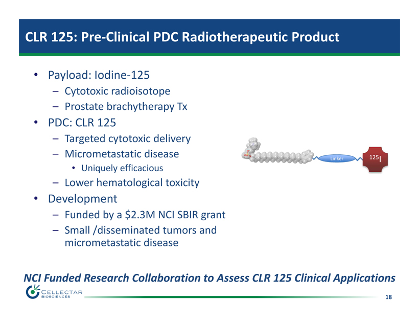 18 CLR 125: Pre - Clinical PDC Radiotherapeutic Product • Payload: Iodine - 125 – Cytotoxic radioisotope – Prostate brachytherapy Tx • PDC : CLR 125 – Targeted cytotoxic delivery – Micrometastatic disease • Uniquely efficacious – Lower hematological toxicity • Development – F unded by a $2.3M NCI SBIR grant – S mall /disseminated tumors and micrometastatic disease Linker NCI Funded Research Collaboration to Assess CLR 125 Clinical Applications 125 I