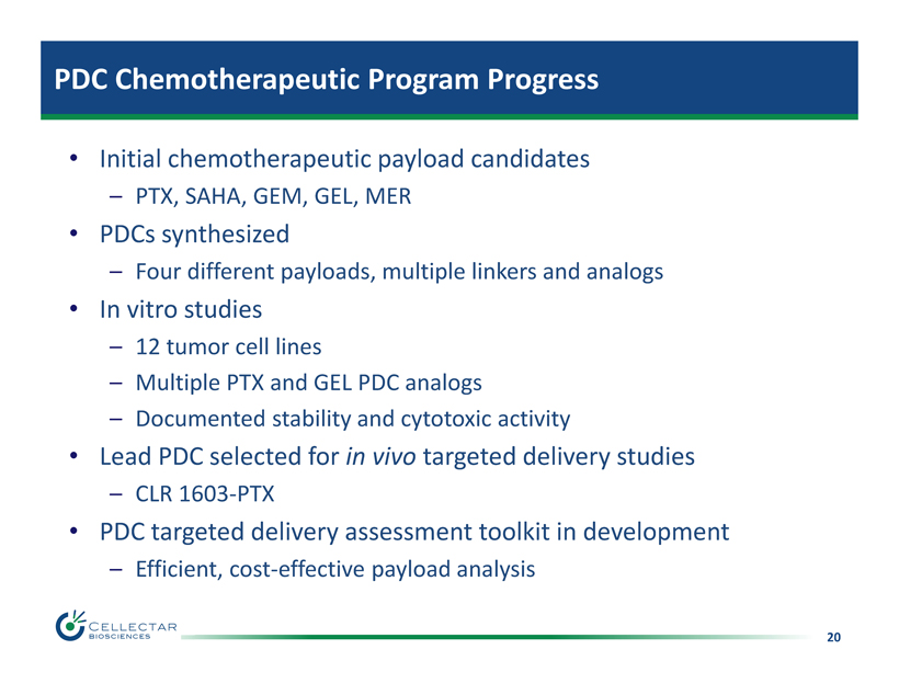19 PDC Chemotherapeutic Program Overview • Objective – Develop chemotherapy PDCs with improved efficacy & tolerability • Clinical rationale – Chemotherapeutics highly effective, yet highly toxic drugs – Improve drug therapeutic index through targeted delivery – Cancer stem cell delivery – increased durability • Business rationale – Many failed, pre - clinical, clinical and on market chemo's – New products, new patent life & life cycle management – Reduced regulatory hurdles Creating Opportunities for Clinical Development Partnerships