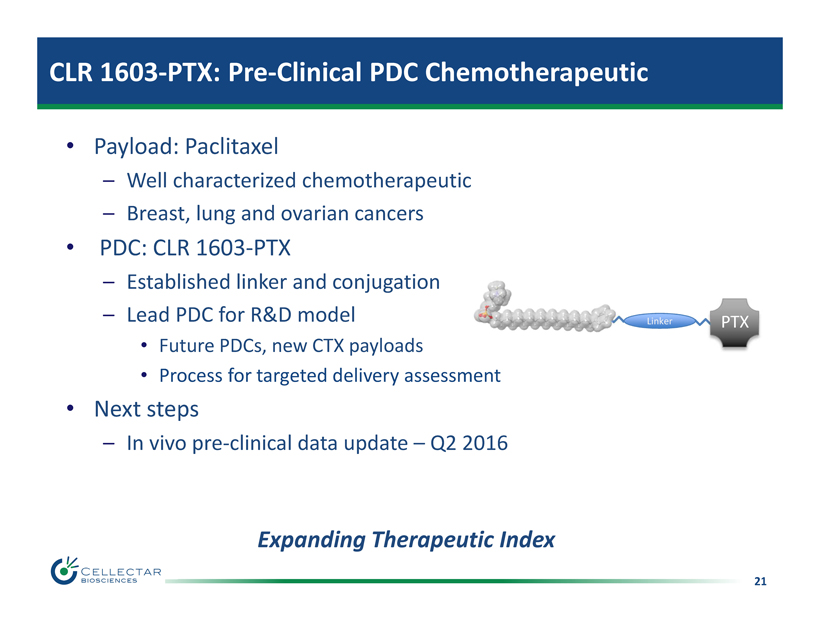 20 PDC Chemotherapeutic Program Progress • Initial chemotherapeutic payload candidates – PTX, SAHA, GEM, GEL, MER • PDCs synthesized – Four different payloads, multiple linkers and analogs • In vitro studies – 12 tumor cell lines – Multiple PTX and GEL PDC analogs – Documented stability and cytotoxic activity • Lead PDC selected for in vivo targeted delivery studies – CLR 1603 - PTX • PDC targeted delivery assessment toolkit in development – Efficient, cost - effective payload analysis