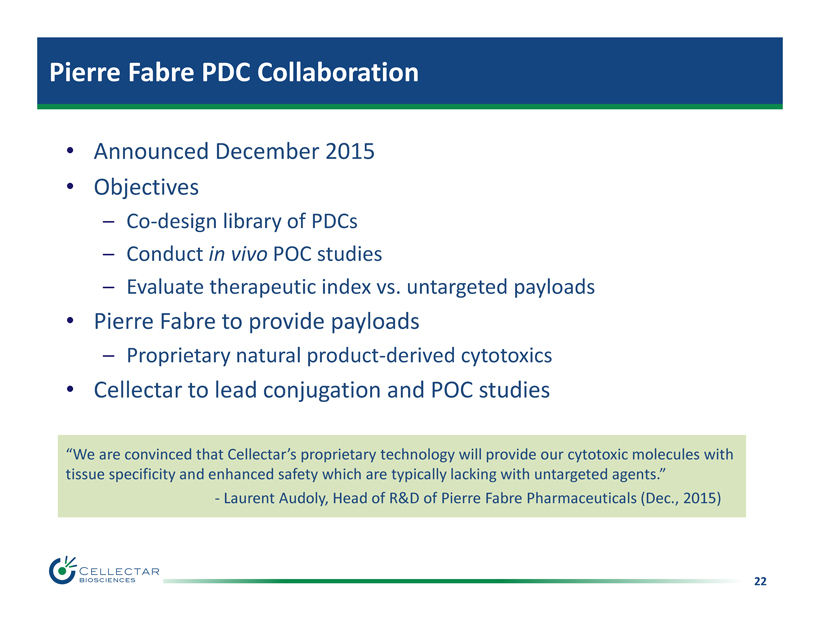 22 Pierre Fabre PDC Collaboration • Announced December 2015 • Objectives – Co - design library of PDCs – Conduct in vivo POC studies – Evaluate therapeutic index vs. untargeted payloads • Pierre Fabre to provide payloads – Proprietary natural product - derived cytotoxics • Cellectar to lead conjugation and POC studies “We are convinced that Cellectar’s proprietary technology will provide our cytotoxic molecules with tissue specificity and enhanced safety which are typically lacking with untargeted agents .” - Laurent Audoly, Head of R&D of Pierre Fabre Pharmaceuticals (Dec., 2015)