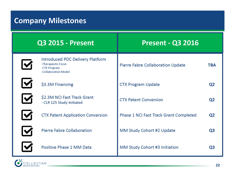 21 CLR 1603 - PTX: Pre - Clinical PDC Chemotherapeutic • Payload: Paclitaxel – Well characterized chemotherapeutic – Breast, lung and ovarian cancers • PDC: CLR 1603 - PTX – Established linker and conjugation – Lead PDC for R&D model • Future PDCs, new CTX payloads • Process for targeted delivery assessment • Next steps – In vivo pre - clinical data update – Q2 2016 Expanding Therapeutic Index Linker PTX