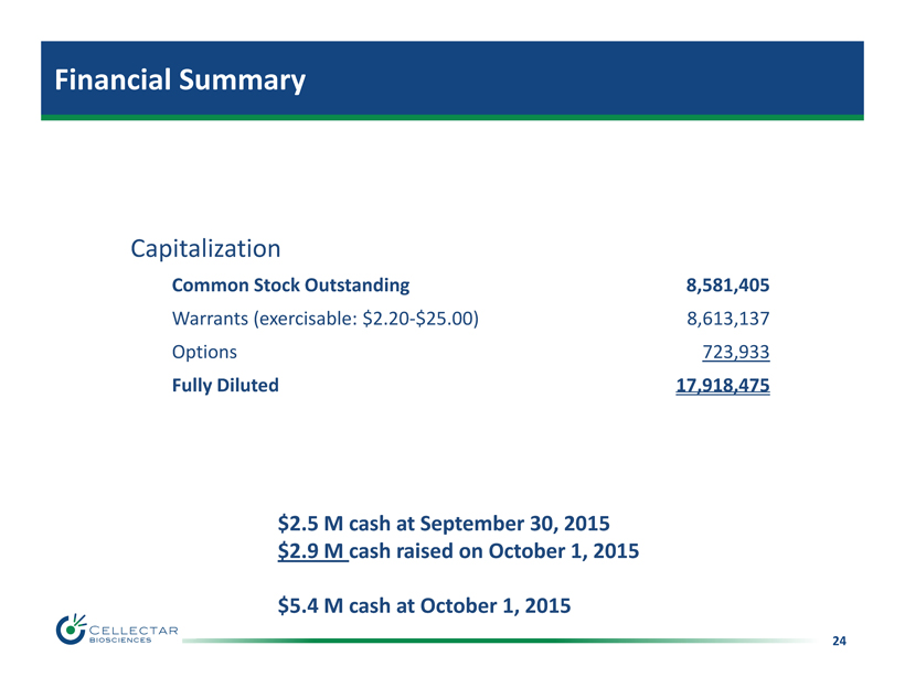 23 Company Milestones Q3 2015 - Present Present - Q3 2016 Introduced PDC Delivery Platform - Therapeutic Focus - CTX Program - Collaboration Model Pierre Fabre Collaboration Update TBA $3.3M Financing CTX Program Update Q2 $2.3M NCI Fast Track Grant - CLR 125 Study Initiated CTX Patent Conversion Q2 CTX Patent Application Conversion Phase 1 NCI Fast Track Grant Completed Q2 Pierre Fabre Collaboration MM Study Cohort #2 Update Q3 Positive Phase 1 MM Data MM Study Cohort #3 Initiation Q3 22