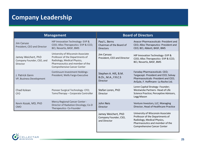24 Financial Summary Capitalization Common Stock Outstanding 8,581,405 Warrants (exercisable: $2.20 - $25.00) 8,613,137 Options 723,933 Fully Diluted 17,918,475 $2.5 M cash at September 30, 2015 $2.9 M cash raised on October 1, 2015 $5.4 M cash at October 1, 2015