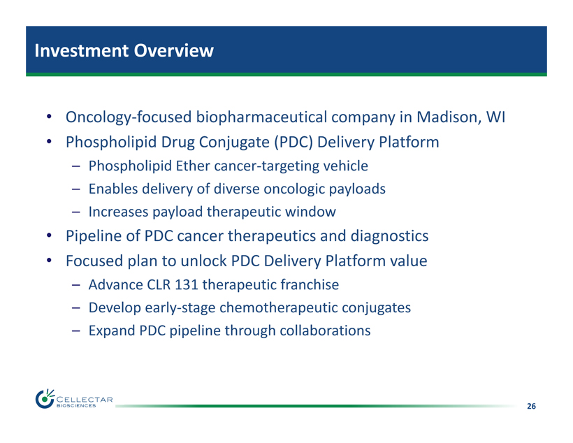 25 Company Leadership Management Jim Caruso President, CEO and Director HIP Innovation Technology - EVP & COO; Allos Therapeutics - EVP & CCO; BCI, Novartis, BASF, BMS Jamey Weichert, PhD Company Founder, CSO, and Director University of Wisconsin Associate Professor of the Departments of Radiology, Medical Physics, Pharmaceutics and member of the Comprehensive Cancer Center J. Patrick Genn VP, Business Development Continuum Investment Holdings - President; Wells Fargo - Executive Chad Kolean CFO Pioneer Surgical Technology - CFO; TomoTherapy – Corporate Controller Kevin Kozak, MD, PhD CMO Mercy Regional Cancer Center - Director of Radiation Oncology; Co - D Therapeutics - Co - Founder Board of Directors Paul L. Berns Chairman of the Board of Directors Anacor Pharmaceuticals - President and CEO; Allos Therapeutics - President and CEO; BCI, Abbott, BASF, BMS Jim Caruso President, CEO and Director HIP Innovation Technology - EVP & COO; Allos Therapeutics - EVP & CCO; BCI, Novartis, BASF, BMS Stephen A. Hill , B.M. B.Ch., M.A., F.R.C.S Director Faraday Pharmaceuticals - CEO; Targacept - President and CEO; Solvay Pharmaceuticals - President and CEO; ArQule, F. Hoffmann - La Roche Ltd. Stefan Loren, PhD Director Loren Capital Strategy - Founder; Westwicke Partners - Head of Life Science Practice; Perceptive Advisors, Legg Mason John Neis Director Venture Investors, LLC; Managing Director, Head of Healthcare Practice Jamey Weichert, PhD Company Founder, CSO, and Director University of Wisconsin Associate Professor of the Departments of Radiology, Medical Physics, Pharmaceutics and member of the Comprehensive Cancer Center