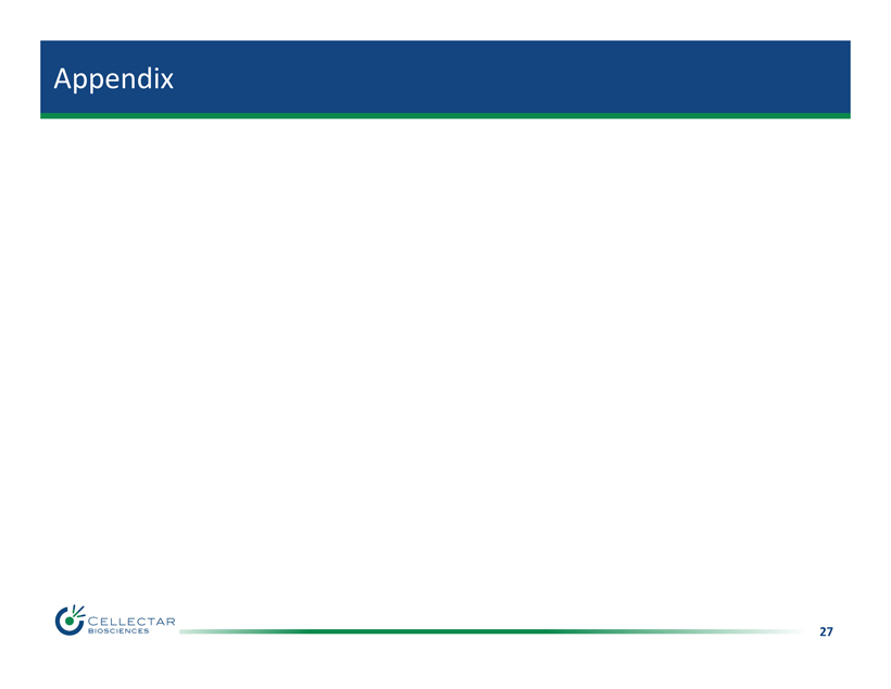 26 Investment Overview • Oncology - focused biopharmaceutical company in Madison, WI • Phospholipid Drug Conjugate (PDC) Delivery P latform – Phospholipid Ether cancer - targeting v ehicle – Enables delivery of diverse oncologic payloads – Increases payload therapeutic window • Pipeline of PDC cancer therapeutics and diagnostics • Focused plan to unlock PDC Delivery Platform value – Advance CLR 131 therapeutic franchise – Develop early - stage chemotherapeutic conjugates – Expand PDC pipeline through collaborations