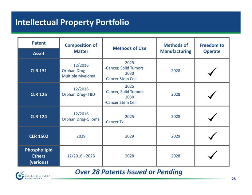 28 Intellectual Property Portfolio Patent Composition of Matter Methods of Use Methods of Manufacturing Freedom to Operate Asset CLR 131 12/2016 Orphan Drug - Multiple Myeloma 2025 - Cancer, Solid Tumors 2030 - Cancer Stem Cell 2028 CLR 125 12/2016 Orphan Drug - TBD 2025 - Cancer, Solid Tumors 2030 - Cancer Stem Cell 2028 CLR 124 12/2016 Orphan Drug - Glioma 2025 - Cancer Tx 2028 CLR 1502 2029 2029 2029 Phospholipid Ethers (various) 12/2016 - 2028 2028 2028 Over 28 Patents Issued or Pending