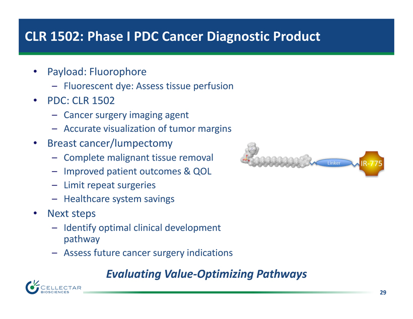 29 CLR 1502: Phase I PDC Cancer Diagnostic Product • Payload: Fluorophore – Fluorescent dye: Assess tissue perfusion • PDC: CLR 1502 – Cancer surgery i maging agent – Accurate visualization of tumor margins • Breast cancer/lumpectomy – Complete malignant tissue removal – Improved patient outcomes & QOL – Limit repeat surgeries – Healthcare system savings • Next steps – Identify optimal clinical development pathway – Assess future cancer surgery indications Evaluating Value - Optimizing Pathways