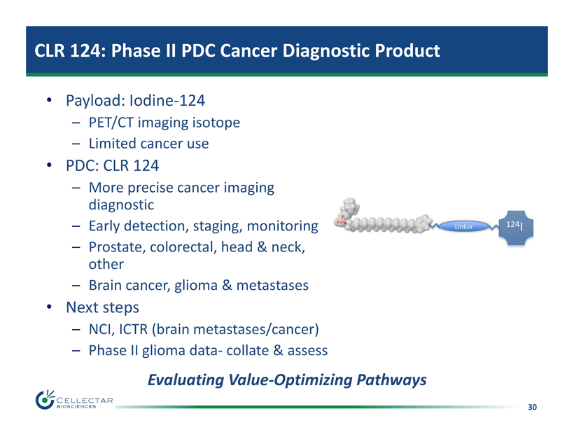 30 CLR 124: Phase II PDC Cancer Diagnostic Product • Payload: Iodine - 124 – PET/CT imaging isotope – Limited cancer use • PDC: CLR 124 – More precise cancer imaging diagnostic – Early detection, staging, monitoring – Prostate , colorectal, head & neck , other – Brain cancer, glioma & metastases • Next steps – NCI, ICTR (brain metastases/cancer) – Phase II glioma data - collate & assess Evaluating Value - Optimizing Pathways 124
