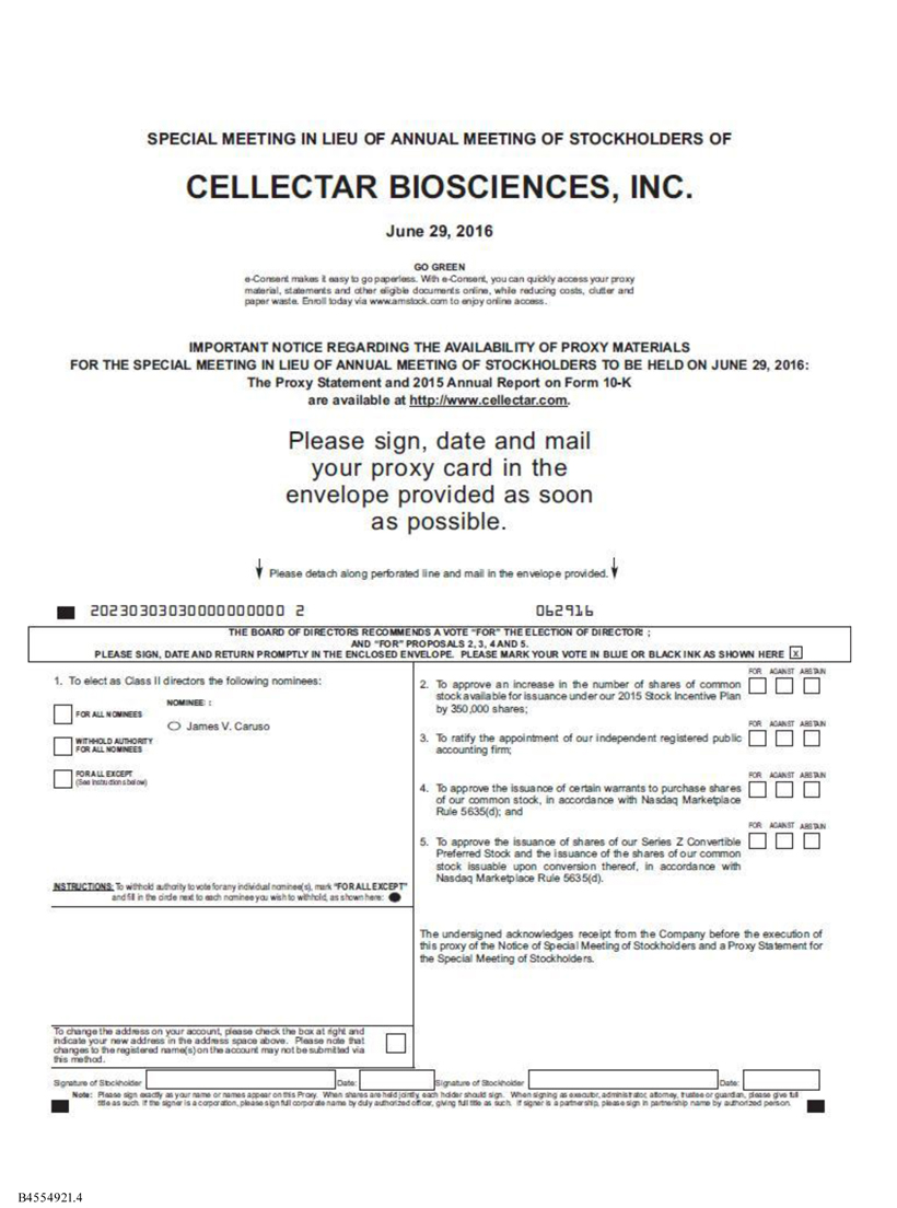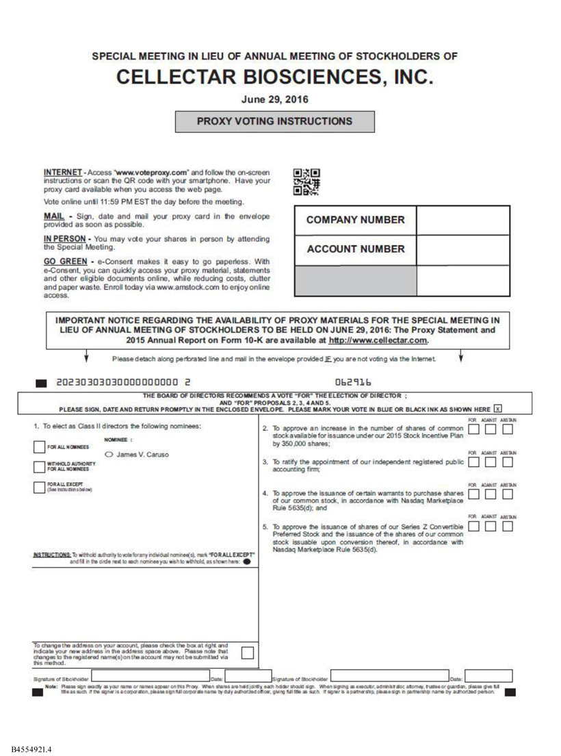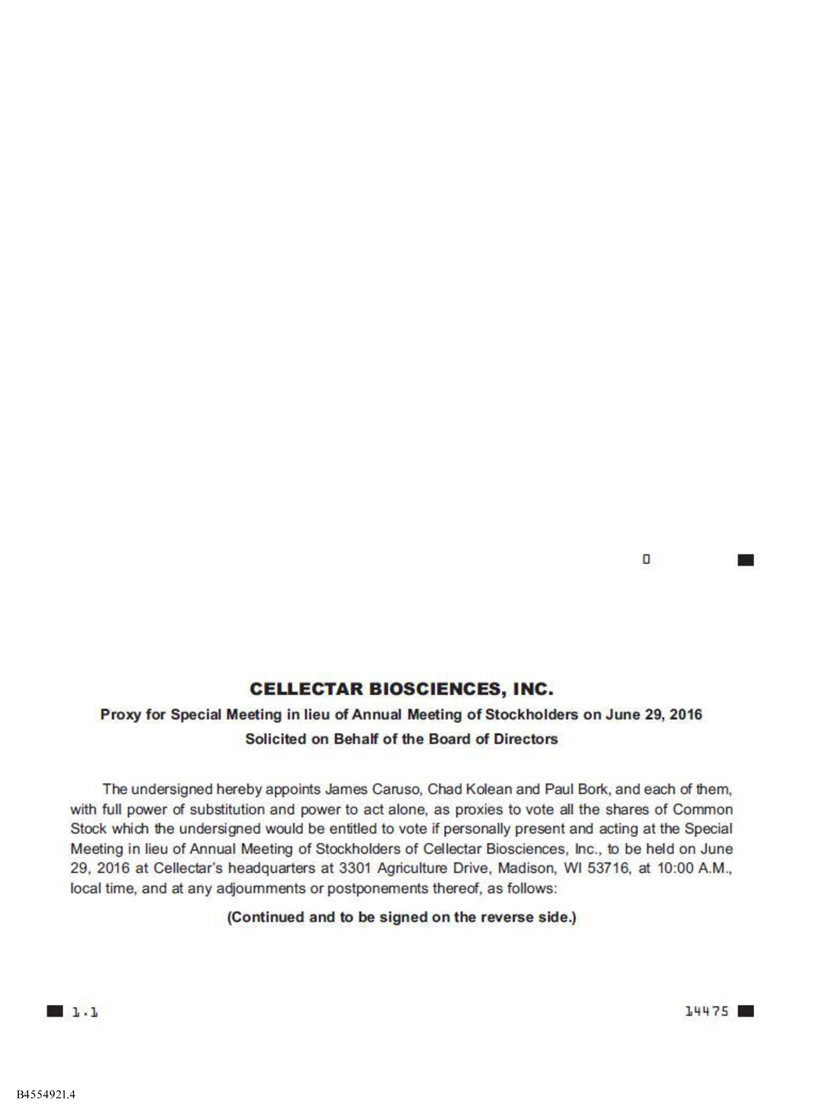 A special meeting of stockholders in lieu of the 2016 Annual Meeting of Stockholders of Cellectar Biosciences, Inc. (the “Special Meeting”) will be held on Wednesday, June 29, 2016 at 10:00 A.M., local time, at its headquarters at 3301 Agriculture Drive, Madison, Wisconsin 53716, for the following purposes: