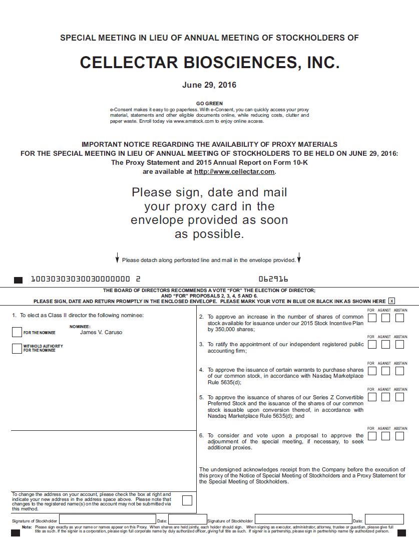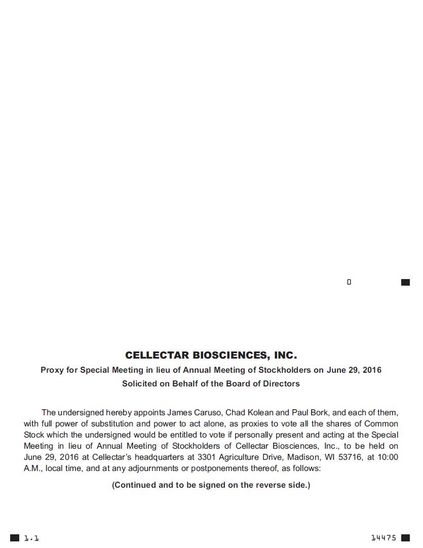 A special meeting of stockholders in lieu of the 2016 Annual Meeting of Stockholders of Cellectar Biosciences, Inc. (the “Special Meeting”) will be held on Wednesday, June 29, 2016 at 10:00 A.M., local time, at its headquarters at 3301 Agriculture Drive, Madison, Wisconsin 53716, for the following purposes: