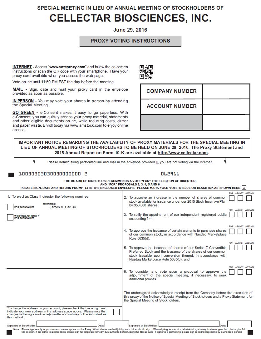 Our Annual Report on Form 10-K for the fiscal year ended December 31, 2015, including financial statements audited by Grant Thornton LLP, our independent registered public accounting firm, is being sent to each of our stockholders simultaneously with this proxy statement. The notice of special meeting, this proxy statement, and our 2015 Annual Report on Form 10-K are also available on the Internet at http://www.cellectar.com. This web site does not use “cookies” to track or identify visitors to the web site. Directions to the Special Meeting are available on the Internet at http://www.cellectar.com.