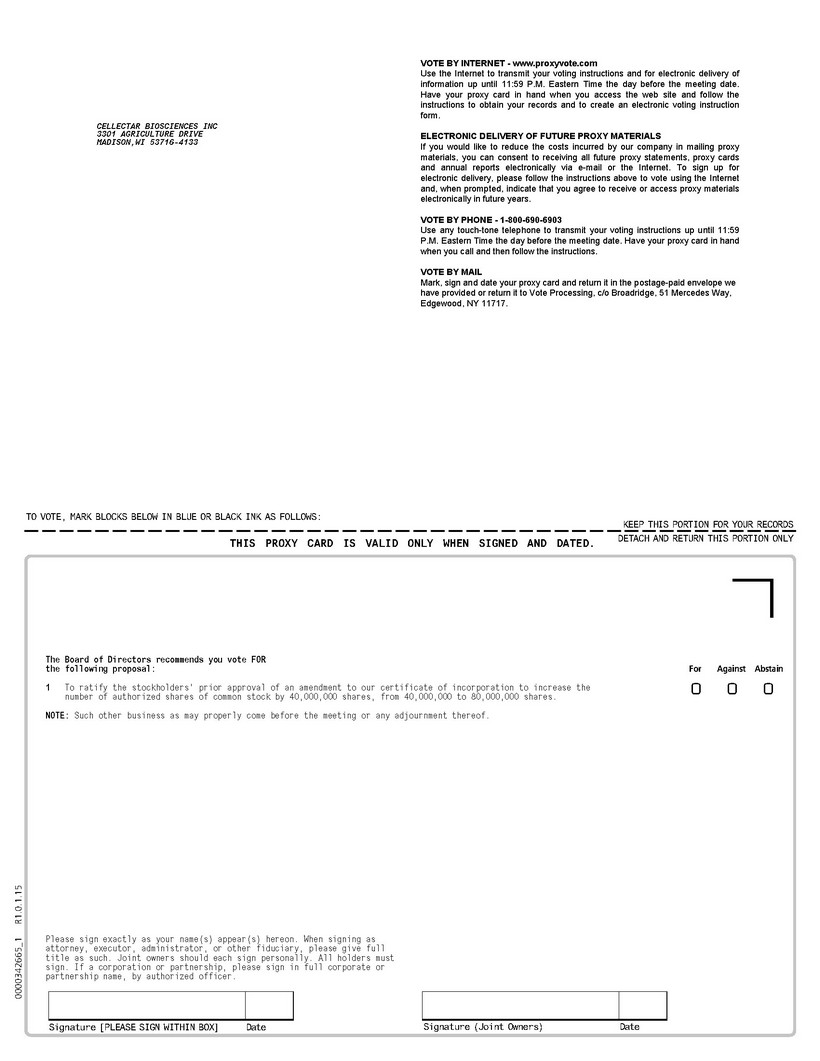 THIS PROXY CARD IS VALID ONLY WHEN SIGNED AND DATED. KEEP THIS PORTION FOR YOUR RECORDS DETACH AND RETURN THIS PORTION ONLY TO VOTE, MARK BLOCKS BELOW IN BLUE OR BLACK INK AS FOLLOWS: Signature [PLEASE SIGN WITHIN BOX] Date Signature (Joint Owners) Date 0 0 0 0000342665_1 R1.0.1.15 CELLECTAR BIOSCIENCES INC 3301 AGRICULTURE DRIVE MADISON,WI 53716-4133 VOTE BY INTERNET - www.proxyvote.com Use the Internet to transmit your voting instructions and for electronic delivery of information up until 11:59 P.M. Eastern Time the day before the meeting date. Have your proxy card in hand when you access the web site and follow the instructions to obtain your records and to create an electronic voting instruction form. ELECTRONIC DELIVERY OF FUTURE PROXY MATERIALS If you would like to reduce the costs incurred by our company in mailing proxy materials, you can consent to receiving all future proxy statements, proxy cards and annual reports electronically via e-mail or the Internet. To sign up for electronic delivery, please follow the instructions above to vote using the Internet and, when prompted, indicate that you agree to receive or access proxy materials electronically in future years. VOTE BY PHONE - 1-800-690-6903 Use any touch-tone telephone to transmit your voting instructions up until 11:59 P.M. Eastern Time the day before the meeting date. Have your proxy card in hand when you call and then follow the instructions. VOTE BY MAIL Mark, sign and date your proxy card and return it in the postage-paid envelope we have provided or return it to Vote Processing, c/o Broadridge, 51 Mercedes Way, Edgewood, NY 11717. The Board of Directors recommends you vote FOR the following proposal: For Against Abstain 1 To ratify the stockholders' prior approval of an amendment to our certificate of incorporation to increase the number of authorized shares of common stock by 40,000,000 shares, from 40,000,000 to 80,000,000 shares. NOTE: Such other business as may properly come before the meeting or any adjournment thereof. Please sign exactly as your name(s) appear(s) hereon. When signing as attorney, executor, administrator, or other fiduciary, please give full title as such. Joint owners should each sign personally. All holders must sign. If a corporation or partnership, please sign in full corporate or partnership name, by authorized officer. 0000342665_2 R1.0.1.15