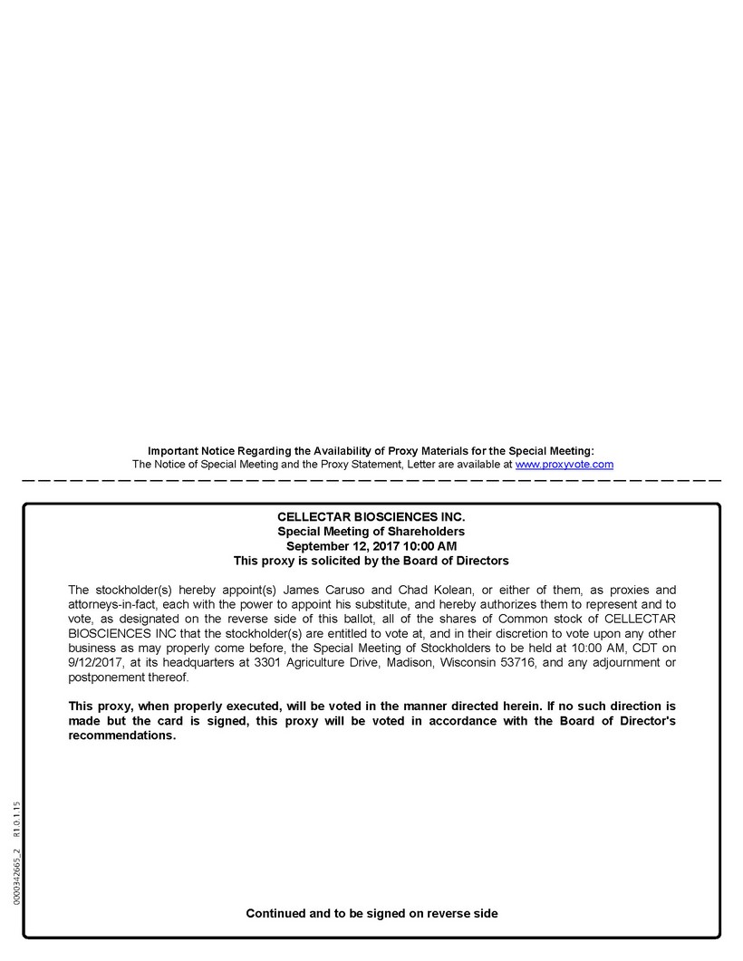 Important Notice Regarding the Availability of Proxy Materials for the Special Meeting: The Notice of Special Meeting and the Proxy Statement, Letter are available at www.proxyvote.com CELLECTAR BIOSCIENCES INC. Special Meeting of Shareholders September 12, 2017 10:00 AM This proxy is solicited by the Board of Directors The stockholder(s) hereby appoint(s) James Caruso and Chad Kolean, or either of them, as proxies and attorneys-in-fact, each with the power to appoint his substitute, and hereby authorizes them to represent and to vote, as designated on the reverse side of this ballot, all of the shares of Common stock of CELLECTAR BIOSCIENCES INC that the stockholder(s) are entitled to vote at, and in their discretion to vote upon any other business as may properly come before, the Special Meeting of Stockholders to be held at 10:00 AM, CDT on 9/12/2017, at its headquarters at 3301 Agriculture Drive, Madison, Wisconsin 53716, and any adjournment or postponement thereof. This proxy, when properly executed, will be voted in the manner directed herein. If no such direction is made but the card is signed, this proxy will be voted in accordance with the Board of Director's recommendations. Continued and to be signed on reverse side
