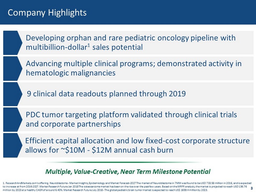 Forward - Looking Statements This presentation contains forward - looking statements . Such statements are valid only as of today and we disclaim any obligation to update this information . These statements are only estimates and predictions and are subject to known and unknown risks and uncertainties that may cause actual future experiences and results to differ materially from the statements made . These statements are based on our current beliefs and expectations as to such future outcomes . Drug discovery and development involve a high degree of risk . Factors that might cause such a material difference include, among others, uncertainties related to the ability to raise additional capital required to complete the development programs described herein, uncertainties related to the disruptions at our sole supplier of CLR 131 , the ability to attract and retain partners for our technologies, the identification of lead compounds, the successful preclinical development thereof, the completion of clinical trials, the FDA review process and other government regulation, the ability of our pharmaceutical collaborators to successfully develop and commercialize drug candidates, competition from other pharmaceutical companies, product pricing and third - party reimbursement . This presentation includes industry and market data that we obtained from industry publications and journals, third-party studies and surveys, internal company studies and surveys, and other publicly available information . Industry publications and surveys generally state that the information contained therein has been obtained from sources believed to be reliable . Although we believe the industry and market data to be reliable as of the date of this presentation, this information could prove to be inaccurate . Industry and market data could be wrong because of the method by which sources obtained their data and because information cannot always be verified with complete certainty due to the limits on the availability and reliability of raw data, the voluntary nature of the data gathering process and other limitations and uncertainties . In addition, we do not know all of the assumptions that were used in preparing the forecasts from the sources relied upon or cited herein . A complete description of risks and uncertainties related to our business is contained in our periodic reports filed with the Securities and Exchange Commission including our Form 10 - K for the year ended December 31 , 2017 and our Form 10 - Q for the quarterly period ended June 30 , 2018 . 2
