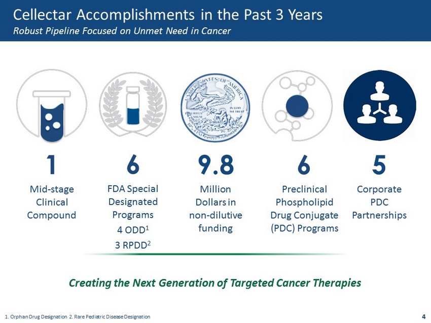 Cellectar Accomplishments in the Past 3 Years Robust Pipeline Focused on Unmet Need in Cancer 1 Mid - stage Clinical Compound 6 FDA Special Designated Programs 4 ODD 1 3 RPDD 2 9.8 Million Dollars in non - dilutive funding 6 Preclinical Phospholipid Drug Conjugate (PDC) Programs Creating the Next Generation of Targeted Cancer Therapies 5 Corporate PDC Partnerships 4 1. Orphan Drug Designation 2. Rare Pediatric Disease Designation