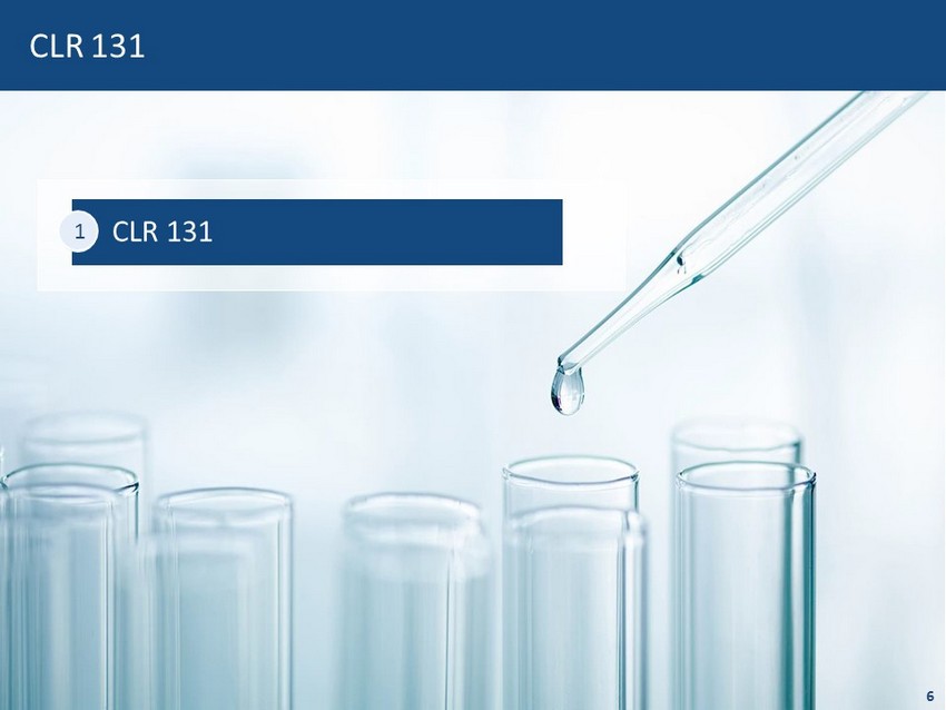 Pipeline Focus on Niche Oncology Indications with Accelerated Commercial Timelines to Scalable Markets PDC 1 Indications Discovery Pre - IND Phase 1 Phase 2 Payload CLR 131 Multiple Myeloma 2 Iodine - 131 B - Cell Lymphomas 2 Pediatric Cancer Head & Neck 3 CLR 1700 Hematologic Tumors BTK 4 CLR 1900 Solid Tumors Undisclosed CLR 1800 Solid Tumors CLR 2000 Performance - based CLR 2100 Solid Tumors CLR 2200 Solid Tumors CLR 12120 Solid Tumors Current Partnerships 5 1. Phospholipid Drug Conjugates 2. Phase 2 partially funded by $2M NCI Fast Track Grant 3. Predominately funded by Univer sit y of Wisconsin NCI SPORE Grant 4. Burton’s Tyrosine Kinase Leverage POC Data in Larger Opportunities to Attract Partners