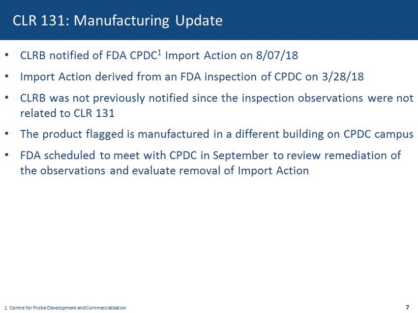7 CLR 131: Manufacturing Update • CLRB notified of FDA CPDC 1 Import Action on 8/07/18 • Import Action derived from an FDA inspection of CPDC on 3/28/18 • CLRB was not previously notified since the inspection observations were not related to CLR 131 • The product flagged is manufactured in a different building on CPDC campus • FDA scheduled to meet with CPDC in September to review remediation of the observations and evaluate removal of Import Action 1. Centre for Probe Development and Commercialization