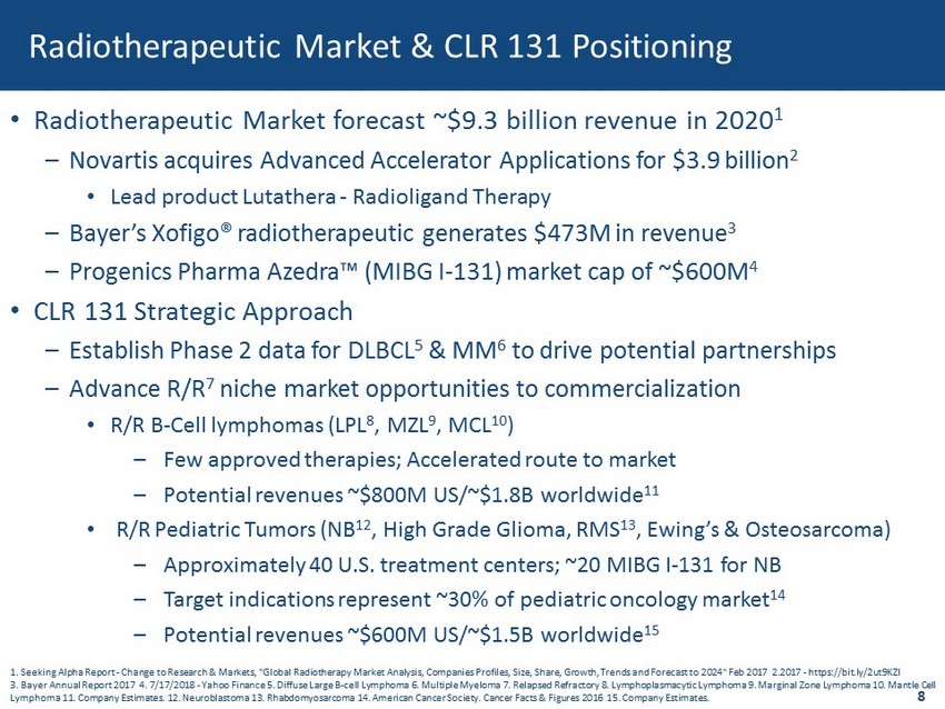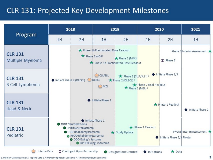 • Radiotherapeutic Market forecast ~$9.3 billion revenue in 2020 1 – Novartis acquires Advanced Accelerator Applications for $3.9 billion 2 • Lead product Lutathera - Radioligand Therapy – Bayer’s Xofigo® radiotherapeutic generates $473M in revenue 3 – Progenics Pharma Azedra™ (MIBG I - 131) market cap of ~$600M 4 • CLR 131 Strategic Approach – Establish Phase 2 data for DLBCL 5 & MM 6 to drive potential partnerships – Advance R/R 7 niche market opportunities to commercialization • R/R B - Cell lymphomas (LPL 8 , MZL 9 , MCL 10 ) – Few approved therapies; Accelerated route to market – Potential revenues ~$800M US/~$1.8B worldwide 11 • R/R Pediatric Tumors ( NB 12 , High Grade Glioma, RMS 13 , Ewing’s & Osteosarcoma) – Approximately 40 U.S. treatment centers; ~20 MIBG I - 131 for NB – Target indications represent ~30% of pediatric oncology market 14 – Potential revenues ~$600M US/~$1.5B worldwide 15 8 Radiotherapeutic Market & CLR 131 Positioning 1. Seeking Alpha Report - Change to Research & Markets, "Global Radiotherapy Market Analysis, Companies Profiles, Size, Share, G rowth, Trends and Forecast to 2024" Feb 2017 2.2017 - https://bit.ly/2ut9KZI 3. Bayer Annual Report 2017 4. 7/17/2018 - Yahoo Finance 5. Diffuse Large B - cell Lymphoma 6. Multiple Myeloma 7. Relapsed Refra ctory 8. Lymphoplasmacytic Lymphoma 9. Marginal Zone Lymphoma 10. Mantle Cell Lymphoma 11. Company Estimates. 12. Neuroblastoma 13. Rhabdomyosarcoma 14. American Cancer Society. Cancer Facts & Figures 2016 15. Company Estimates.