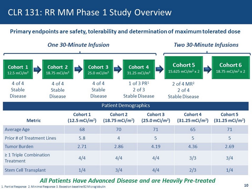 Program 2018 2019 2020 2021 1H 2H 1H 2H 1H 2H 1H CLR 131 Multiple Myeloma CLR 131 B - Cell Lymphoma CLR 131 Head & Neck CLR 131 Pediatric Phase 1b Fractionated Dose Readout Initiate Phase 2 (DLBCL) Phase 3 MZL Phase 2 (DLBCL) 2 Initiate Phase 1 Initiate Phase 1 Initiate Phase 2 Phase 3 Interim Assessment Pivotal Interim Assessment Phase 1 mOS 1 1. Median Overall Survival 2. Topline Data 3. Chronic Lymphocytic Leukemia 4 . Small Lymphocytic Leukemia ODD Neuroblastoma ODD Rhabdomyosarcoma RPDD Neuroblastoma RPDD Rhabdomyosarcoma 9 CLR 131: Projected Key Development Milestones Initiate Phase 2/3 Phase 1 Readout Initiate Phase 2/3 Pivotal Phase 2 Final Readout Phase 1 Readout Phase 1b Fractionated Dose Readout Study Update ODD Ewing’s Sarcoma Phase 2 ( CLL 3 /SLL 4 ) 2 DLBCL Designations Granted Initiations Data Contingent Upon Partnership Interim Data CLL/SLL Phase 2 (MZL) 2 Phase 2 (MM) 2 RPDD Ewing’s Sarcoma