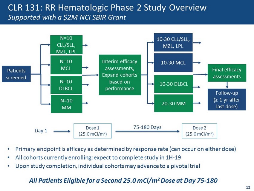 TIME (MONTHS) 15.0 months SURVIVAL ONGOING 0 5 10 15 Key Results To Date 1 • All cohorts determined to be safe and well - tolerated by independent DMC 3 • No patients experiencing peripheral neuropathy, deep vein thrombosis, cardiotoxicities, embolisms or GI toxicities • Cytopenias most common adverse events – All viewed as predictable & manageable • ≥ Grade 3 fatigue and fever = 7% • No change in liver enzymes or renal function Cohort 1 (12.50) 4.75 2.05 + 0.91 2.0 Cohort 2 (18.75) 4.75 2.74 + 0.93 2.0 Cohort 3 (25.00) 6.75 2.52 + 1.22 3.0 Cohort 4 (31.25) 4.25 3.23 + 0.93 3.0 Cohort 5 (15.625 x 2) 5 2.95 + 1.10 3.0 Pooled Phase 1 study: Overall Survival (n=15) 1. Study ongoing n=19 - Final results may differ from data presented 2. Per patient 3. Data Monitoring Committee Adverse Events Avg. Number 2 Median Grade Avg. Grade 2 Survival Data last updated 02/20/18; mOS Not Reached to Date 11 CLR 131: RR MM Tolerability & Overall Survival (OS)
