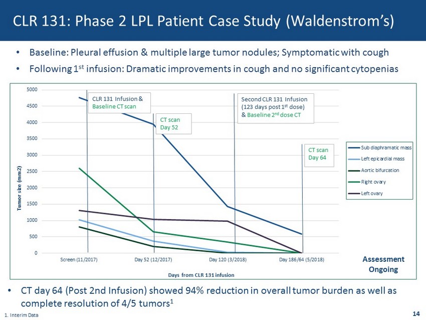 CLR 131: Phase 2 DLBCL Interim Data • Diffuse Large B - cell Lymphoma (DLBCL) is an aggressive form of lymphoma, accounting for ~30% of newly diagnosed cases in the U.S. 1 • DLBCL cohort opened 1Q - 18 • 33% Overall Response Rate (ORR) to date • 50% Clinical Benefit Rate (CBR) to date • Of responses observed, overall tumor reduction ranged from 60 - 90% 13 1. According to the Lymphoma Research Foundation.
