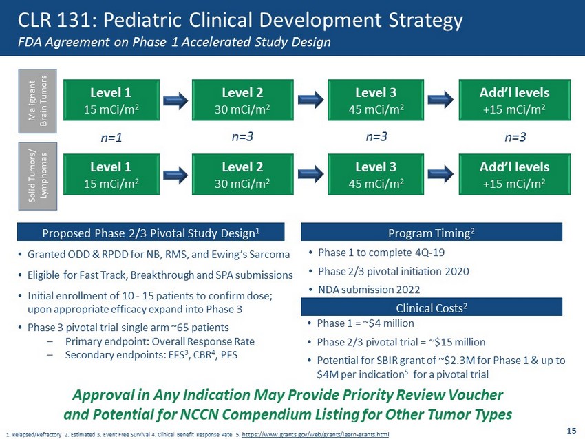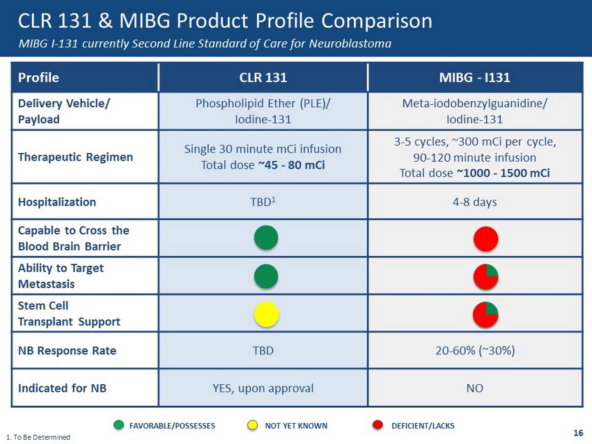 Level 1 15 mCi/m 2 Level 2 30 mCi/m 2 Level 3 45 mCi/m 2 Add’l levels +15 mCi/m 2 n=1 n=3 n=3 n=3 Proposed Phase 2/3 Pivotal Study Design 1 Program Timin g 2 Clinical Costs 2 • Granted ODD & RPDD for NB, RMS, and Ewing’s Sarcoma • Eligible for Fast Track, Breakthrough and SPA submissions • Initial enrollment of 10 - 15 patients to confirm dose; upon appropriate efficacy expand into Phase 3 • Phase 3 pivotal trial single arm ~65 patients – Primary endpoint: Overall Response Rate – Secondary endpoints: EFS 3 , CBR 4 , PFS • Phase 1 to complete 4Q - 19 • Phase 2/3 pivotal initiation 2020 • NDA submission 2022 • Phase 1 = ~$4 million • Phase 2/3 pivotal trial = ~$15 million • Potential for SBIR grant of ~$2.3M for Phase 1 & up to $4M per indication 5 for a pivotal trial 1. Relapsed/Refractory 2. Estimated 3. Event Free Survival 4. Clinical Benefit Response Rate 5. https://www.grants.gov/web/grants/learn - grants.html Level 1 15 mCi/m 2 Level 2 30 mCi/m 2 Level 3 45 mCi/m 2 Add’l levels +15 mCi/m 2 Malignant Brain Tumors Solid Tumors/ Lymphomas 15 CLR 131: Pediatric Clinical Development Strategy FDA Agreement on Phase 1 Accelerated Study Design Approval in Any Indication May Provide Priority Review Voucher and Potential for NCCN Compendium Listing for Other Tumor Types