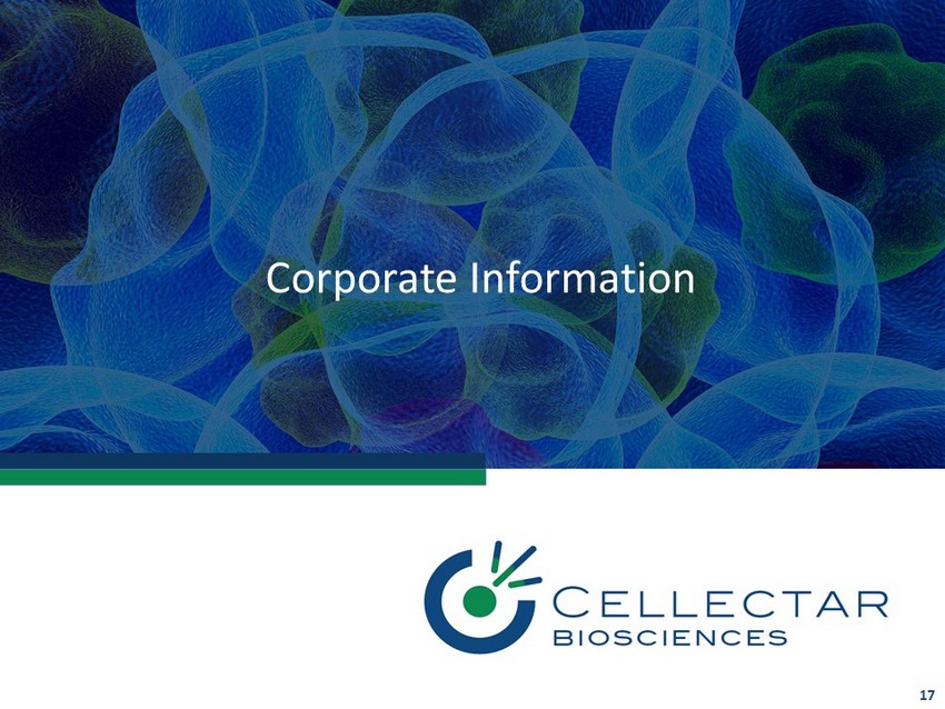 CLR 131 & MIBG Product Profile Comparison Profile CLR 131 MIBG - I131 Delivery Vehicle/ Payload Phospholipid Ether (PLE)/ Iodine - 131 Meta - iodobenzylguanidine/ Iodine - 131 Therapeutic Regimen Single 30 minute mCi infusion Total dose ~45 - 80 mCi 3 - 5 cycles, ~300 mCi per cycle, 90 - 120 minute infusion Total dose ~1000 - 1500 mC i Hospitalization TBD 1 4 - 8 days Capable to Cross the Blood Brain Barrier Ability to Target Metastasis Stem Cell Transplant Support NB Response Rate TBD 20 - 60% (~30%) Indicated for NB YES, u pon approval NO MIBG I - 131 currently Second Line Standard of Care for Neuroblastoma 16 FAVORABLE/POSSESSES NOT YET KNOWN DEFICIENT/LACKS 1. To Be Determined