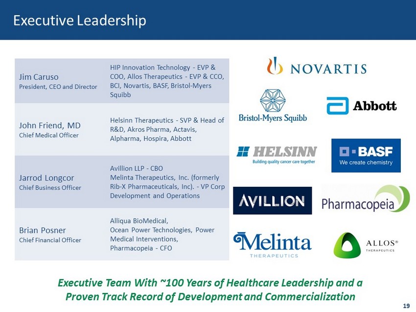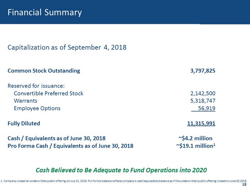 Financial Summary Capitalization as of September 4, 2018 Common Stock Outstanding 3,797,825 Reserved for issuance: Convertible Preferred Stock 2,142,500 Warrants 5,318,747 Employee Options 56,919 Fully Diluted 11,315,991 Cash / Equivalents as of June 30, 2018 ~$4.2 million Pro Forma Cash / Equivalents as of June 30, 2018 ~$19.1 million 1 Cash Believed to Be Adequate to Fund Operations into 2020 18 1. Company closed an underwritten public offering on July 31, 2018. Pro forma balance reflects company’s cash/equivalents bal anc e as if the underwritten public offering closed on June 30,2018.