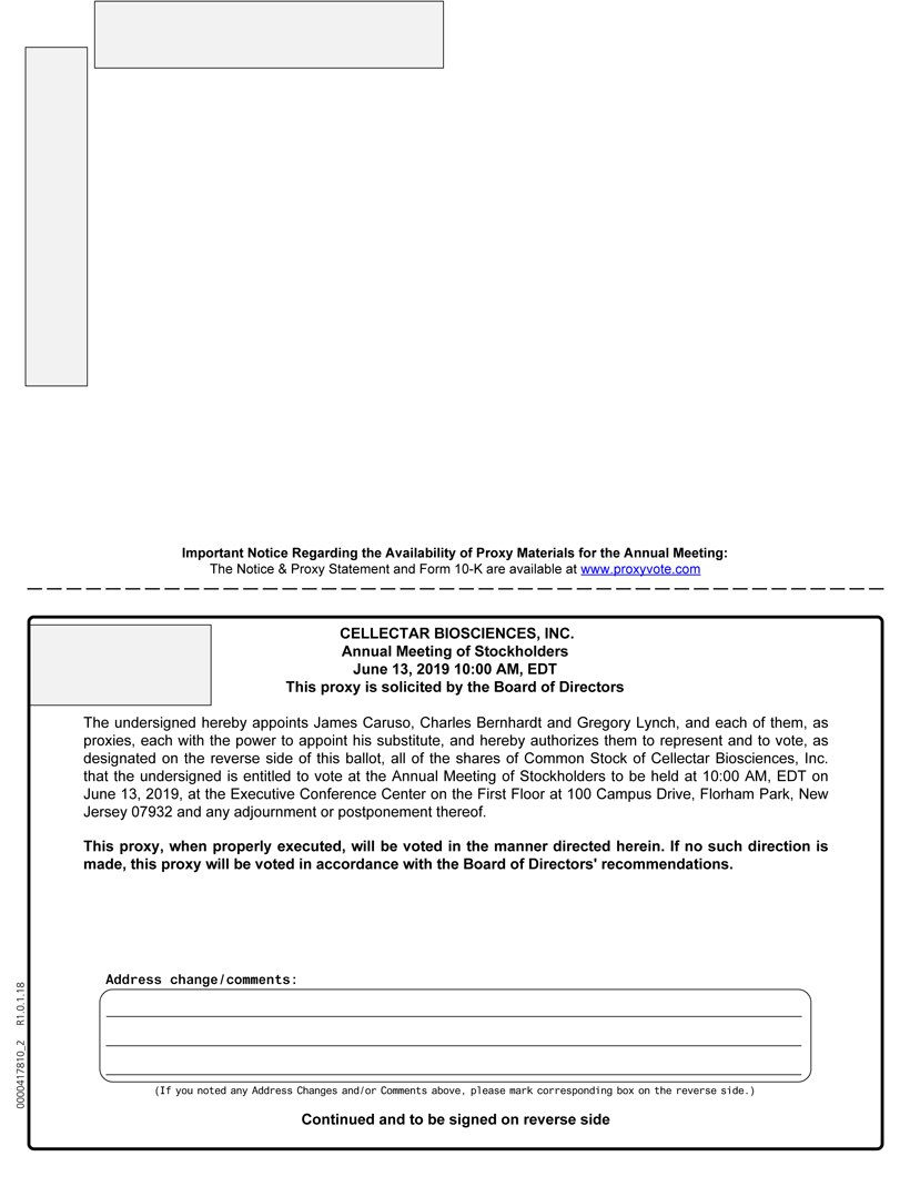 CELLECTAR BIOSCIENCES, INC. 100 Campus Drive Florham Park, New Jersey 07932 Investor Address Line 1 Investor Address Line 2 Investor Address Line 3 Investor Address Line 4 Investor Address Line 5 John Sample 1234 ANYWHERE STREET ANY CITY, ON A1A 1A1 VOTE BY INTERNET - www.proxyvote.com Use the Internet to transmit your voting instructions and for electronic delivery of information up until 11:59 p.m. Eastern Time the day before the cut-off date or meeting date. Have your proxy card in hand when you access the web site and follow the instructions to obtain your records and to create an electronic voting instruction form. ELECTRONIC DELIVERY OF FUTURE PROXY MATERIALS If you would like to reduce the costs incurred by our company in mailing proxy materials, you can consent to receiving all future proxy statements, proxy cards and annual reports electronically via e-mail or the Internet. To sign up for electronic delivery, please follow the instructions above to vote using the Internet and, when prompted, indicate that you agree to receive or access proxy materials electronically in future years. VOTE BY PHONE - 1-800-690-6903 Use any touch-tone telephone to transmit your voting instructions up until 11:59 p.m. Eastern Time the day before the cut-off date or meeting date. Have your proxy card in hand when you call and then follow the instructions. VOTE BY MAIL Mark, sign and date your proxy card and return it in the postage-paid envelope we have provided or return it to Vote Processing, c/o Broadridge, 51 Mercedes Way, Edgewood, NY 11717. NAME THE COMPANY NAME INC. - COMMON THE COMPANY NAME INC. - CLASS A THE COMPANY NAME INC. - CLASS B THE COMPANY NAME INC. - CLASS C THE COMPANY NAME INC. - CLASS D THE COMPANY NAME INC. - CLASS E THE COMPANY NAME INC. - CLASS F THE COMPANY NAME INC. - 401 K CONTROL # 000000000000000 SHARES 123,456,789,012.12345 123,456,789,012.12345 123,456,789,012.12345 123,456,789,012.12345 123,456,789,012.12345 123,456,789,012.12345 123,456,789,012.12345 123,456,789,012.12345 PAGE 1 OF 2 x TO VOTE, MARK BLOCKS BELOW IN BLUE OR BLACK INK AS FOLLOWS: KEEP THIS PORTION FOR YOUR RECORDS DETACH AND RETURN THIS PORTION ONLY THIS PROXY CARD IS VALID ONLY WHEN SIGNED AND DATED. For Withhold For All To withhold authority to vote for any All All Except individual nominee(s), mark “For All Except” and write the number(s) of the The Board of Directors recommends you vote FOR nominee(s) on the line below. the following: • • • 1. Election of Class II Directors Nominees 01 James V. Caruso 02 Frederick W. Driscoll The Board of Directors recommends you vote FOR proposals 2, 3, 4 and 5. For Against Abstain 2 To approve an increase in the number of shares of common stock available for issuance under our Amended and • • • Restated 2015 Stock Incentive Plan by 700,000 shares; 3 To approve on a non-binding advisory basis the compensation of our named executive officers; • • • 4 To ratify the appointment of Baker Tilly Virchow Krause, LLP as the Company's independent registered public • • • accounting firm for the fiscal year ending December 31, 2019; and 5 To transact such other business as may properly come before the Annual Meeting and at any adjournments or • • • postponements of the Annual Meeting in accordance with our by-laws. NOTE: The undersigned acknowledges receipt from the Company before the execution of this proxy of the Notice of Annual Meeting of Stockholders and a Proxy Statement for the Annual Meeting of Stockholders. For address change/comments, mark here. • • (see reverse for instructions) Yes No Please indicate if you plan to attend this meeting • • HOUSEHOLDING ELECTION - Please indicate if you consent • • to receive certain future investor communications in a single package per household Please sign exactly as your name(s) appear(s) hereon. When signing as attorney, executor, administrator, or other fiduciary, please give full title as such. Joint owners should each sign personally. All holders must sign. If a corporation or partnership, please sign in full corporate or partnership name, by authorized officer. SHARES CUSIP # JOB # SEQUENCE # Signature [PLEASE SIGN WITHIN BOX] Date Signature (Joint Owners) Date