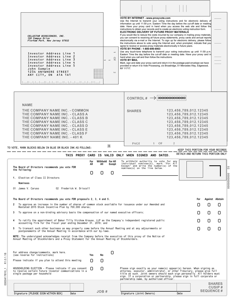 CELLECTAR BIOSCIENCES, INC. 100 Campus Drive Florham Park, New Jersey 07932 Investor Address Line 1 Investor Address Line 2 Investor Address Line 3 Investor Address Line 4 Investor Address Line 5 John Sample 1234 ANYWHERE STREET ANY CITY, ON A1A 1A1 VOTE BY INTERNET - www.proxyvote.com Use the Internet to transmit your voting instructions and for electronic delivery of information up until 11:59 p.m. Eastern Time the day before the cut-off date or meeting date. Have your proxy card in hand when you access the web site and follow the instructions to obtain your records and to create an electronic voting instruction form. ELECTRONIC DELIVERY OF FUTURE PROXY MATERIALS If you would like to reduce the costs incurred by our company in mailing proxy materials, you can consent to receiving all future proxy statements, proxy cards and annual reports electronically via e-mail or the Internet. To sign up for electronic delivery, please follow the instructions above to vote using the Internet and, when prompted, indicate that you agree to receive or access proxy materials electronically in future years. VOTE BY PHONE - 1-800-690-6903 Use any touch-tone telephone to transmit your voting instructions up until 11:59 p.m. Eastern Time the day before the cut-off date or meeting date. Have your proxy card in hand when you call and then follow the instructions. VOTE BY MAIL Mark, sign and date your proxy card and return it in the postage-paid envelope we have provided or return it to Vote Processing, c/o Broadridge, 51 Mercedes Way, Edgewood, NY 11717. NAME THE COMPANY NAME INC. - COMMON THE COMPANY NAME INC. - CLASS A THE COMPANY NAME INC. - CLASS B THE COMPANY NAME INC. - CLASS C THE COMPANY NAME INC. - CLASS D THE COMPANY NAME INC. - CLASS E THE COMPANY NAME INC. - CLASS F THE COMPANY NAME INC. - 401 K CONTROL # 000000000000000 SHARES 123,456,789,012.12345 123,456,789,012.12345 123,456,789,012.12345 123,456,789,012.12345 123,456,789,012.12345 123,456,789,012.12345 123,456,789,012.12345 123,456,789,012.12345 PAGE 1 OF 2 x TO VOTE, MARK BLOCKS BELOW IN BLUE OR BLACK INK AS FOLLOWS: KEEP THIS PORTION FOR YOUR RECORDS DETACH AND RETURN THIS PORTION ONLY THIS PROXY CARD IS VALID ONLY WHEN SIGNED AND DATED. For Withhold For All To withhold authority to vote for any All All Except individual nominee(s), mark “For All Except” and write the number(s) of the The Board of Directors recommends you vote FOR nominee(s) on the line below. the following: • • • 1. Election of Class II Directors Nominees 01 James V. Caruso 02 Frederick W. Driscoll The Board of Directors recommends you vote FOR proposals 2, 3, 4 and 5. For Against Abstain 2 To approve an increase in the number of shares of common stock available for issuance under our Amended and • • • Restated 2015 Stock Incentive Plan by 700,000 shares; 3 To approve on a non-binding advisory basis the compensation of our named executive officers; • • • 4 To ratify the appointment of Baker Tilly Virchow Krause, LLP as the Company's independent registered public • • • accounting firm for the fiscal year ending December 31, 2019; and 5 To transact such other business as may properly come before the Annual Meeting and at any adjournments or • • • postponements of the Annual Meeting in accordance with our by-laws. NOTE: The undersigned acknowledges receipt from the Company before the execution of this proxy of the Notice of Annual Meeting of Stockholders and a Proxy Statement for the Annual Meeting of Stockholders. For address change/comments, mark here. • • (see reverse for instructions) Yes No Please indicate if you plan to attend this meeting • • HOUSEHOLDING ELECTION - Please indicate if you consent • • to receive certain future investor communications in a single package per household Please sign exactly as your name(s) appear(s) hereon. When signing as attorney, executor, administrator, or other fiduciary, please give full title as such. Joint owners should each sign personally. All holders must sign. If a corporation or partnership, please sign in full corporate or partnership name, by authorized officer. SHARES CUSIP # JOB # SEQUENCE # Signature [PLEASE SIGN WITHIN BOX] Date Signature (Joint Owners) Date